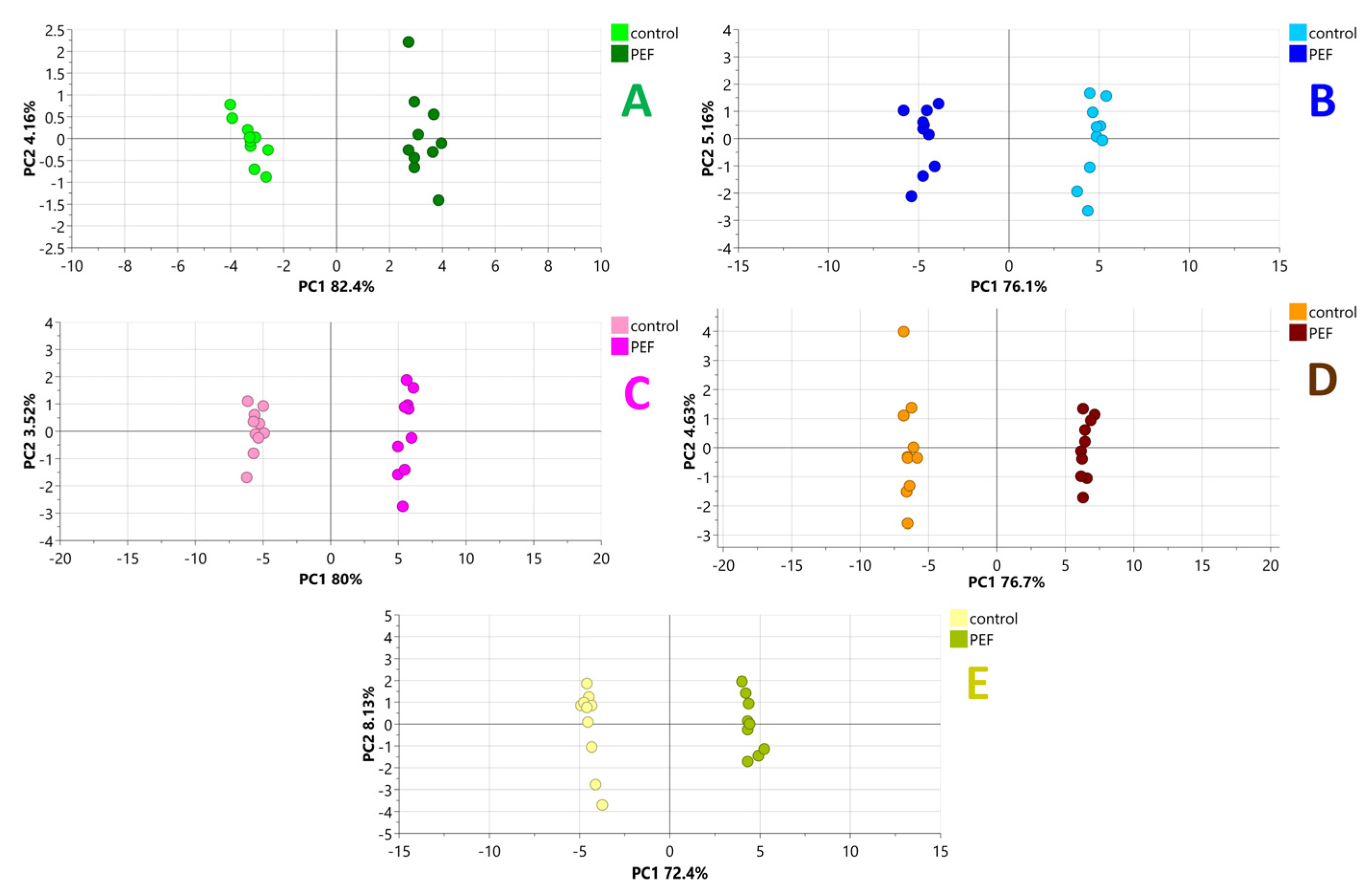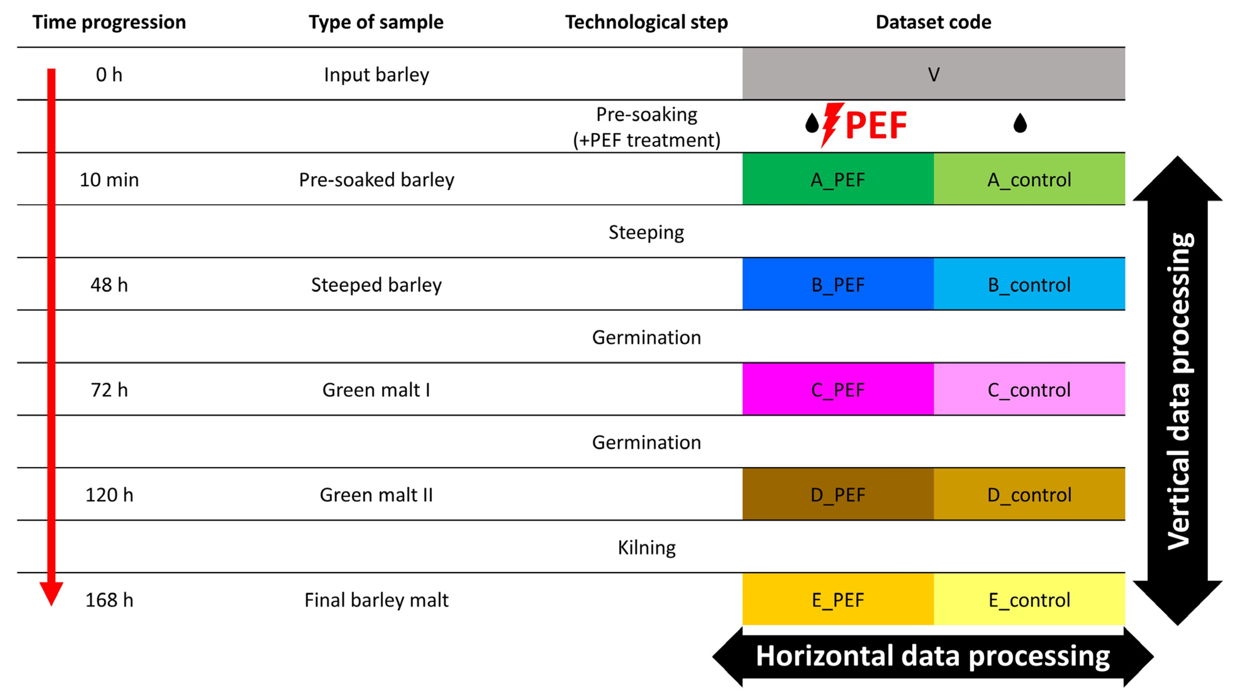 - Stranska, M.; Behner, A.; Ovesna, J.; Svoboda, P.; Hajslova, J. What Happens Inside the Germinating Grain After Microbial Decontamination by Pulsed Electric Field? Data-Driven Multi-Omics Helps Find the Answer. Molecules 2025, 30, 924. [Google Scholar] [CrossRef]