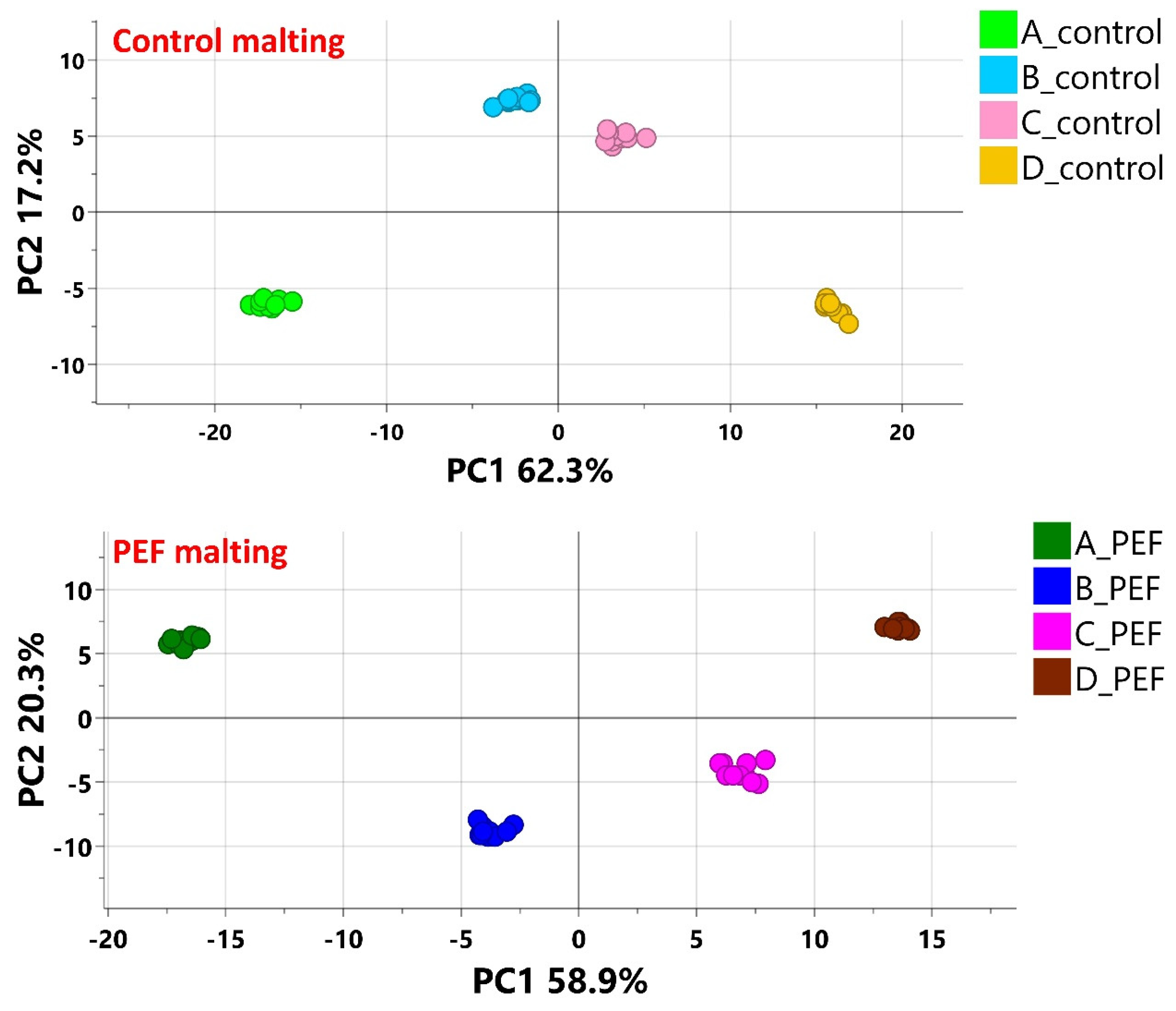 Behner, A.; Prusova, N.; Karabin, M.; Jelinek, L.; Hajslova, J.; Stranska, M. Pulsed Electric Fields Reshape the Malting Barley Metabolome: Insights from UHPLC-HRMS/MS. Molecules 2025, 30, 3953. https://doi.org/10.3390/molecules30193953