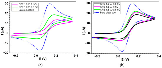 CV curves (0.1 V·s−1) recorded in 1 mM ferrocene solution in 0.1 M TBAP/ACN for CMEs prepared through CPE in L solution (1.3 mM in 0.1 M TBAP/ACN) at different potentials, (a) 1.3 V and (b) 1.6 V, using various electropolymerization charges (solid lines) vs. bare electrode (dashed lines).