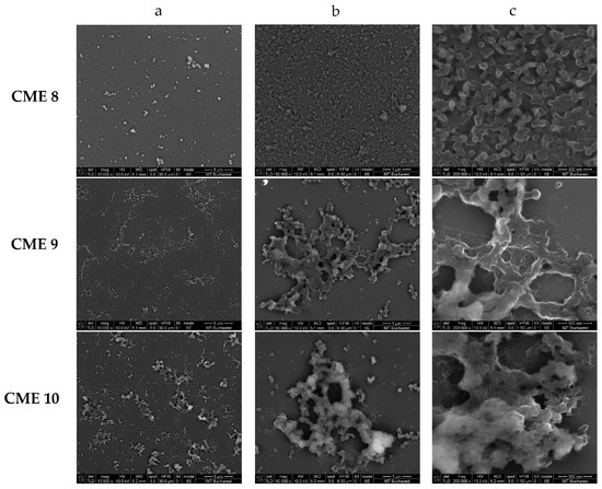 SEM images at different magnifications, 10,000 (a), 50,000 (b), and 100,000 (c), for CME 8 (CPE at +0.9 V, 4 mC), CME 9 (CPE at +1.3 V, 4 mC), and CME 10 (CPE at +1.3 V, 14 mC).