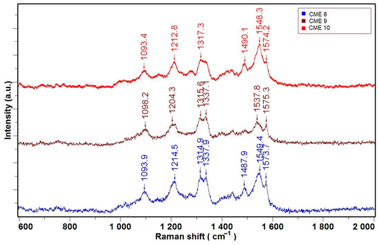 The identified bands in Raman spectra of CME 8–CME 10 (Figure 4) most likely correspond to the following vibration assignments [39,40,41,42]: