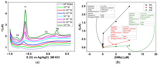 The chemically modified electrodes based on L (L-CMEs) were evaluated with respect to their ability to recognize the heavy metal (HM) ions from aqueous solutions containing Cd(II), Pb(II), Cu(II), and Hg(II) in equal concentrations ranging from 10−8 M to 10−5 M. Taking into account the results obtained during the study of CMEs’ preparation at different electropolymerization potentials and charges, the CMEs’ preparation conditions were chosen. The CMEs used for HM analysis were prepared via CPE at +1.3 V, 1 mC in a 1 mM solution of L in 0.1 M TBAP/ACN. We selected these parameters as proof of concept to determine which cations under investigation respond, which give the best response, etc. After synthesis, the electrodes were rinsed with acetonitrile, conditioned, and overoxidized in a 0.1 M acetate buffer (pH 4.5) according to a procedure previously established [38]. Each conditioned CME was then rinsed with ultrapure water and immersed in an aqueous solution containing the same molar concentration of Cd(II), Pb(II), Cu(II), and Hg(II) ions under magnetic stirring. The amount of each metal ion complexed within the film was quantified using anodic stripping voltammetry (ASV) in acetate buffer, employing software for differential pulse voltammetry (DPV). After a 3 min pre-concentration step at −1.2 V to reduce all metal ions, DPV stripping was performed from −1.2 V to +0.5 V. The resulting DPV curves (Figure 5a) confirmed the presence of HM ions in the L-CME films, with characteristic stripping peaks noticed at −0.82 V (Cd), −0.61 V (Pb), −0.055 V (Cu), and +0.24 V (Hg). The peaks are distinguished from the background noise (the peak height for each cation has been calculated as the difference between the current of the peak and the corresponding current of the background at the peak potential). Figure 5b illustrates the correlation between stripping peak current intensities for the Pb(II) ion and their concentration in the tested solutions. It also contains the DPV dependencies corresponding to the DPV peaks of Hg(II) and Cd(II) (red and green lines, respectively), together with the equations of the straight lines (written in the same colors).