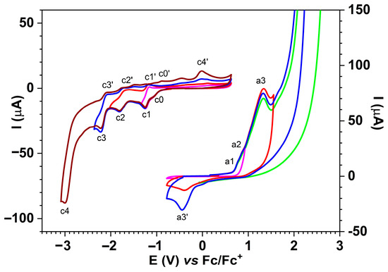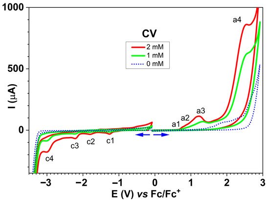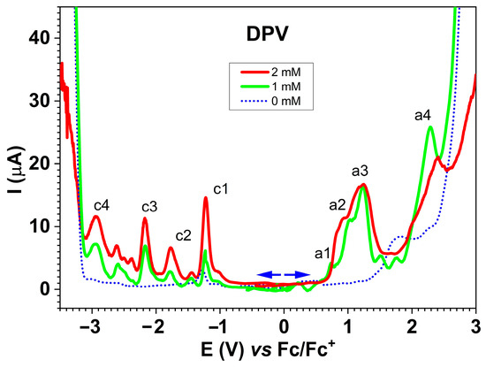 In analyzing the cathodic curves in Figure 6 and Figure S3 (Supplementary Materials), regarding the influence of concentration on the currents in the DPV curves, it can be observed that the currents are higher in all processes attributed to the ligand. For potentials more negative than −3.2 V, reduction of the supporting electrolyte occurs. At a concentration of 2 mM, this process is greatly diminished due to the irreversible process c4. c4 can be attributed to the formation of films through the electroreduction of L, which blocks the electrode surface, as in the case of other azulene compounds (azulene can form films through both electrooxidation and electroreduction; in the latter case, the potential values are higher in absolute values) (azulene is more difficult to reduce than to electrooxidize).
