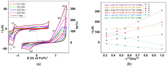 CV curves in the cathodic and anodic potential ranges at various scan rates for [L] = 1 mM in 0.1 M TBAP/ACN (a); linear dependences of a1, a2, a3, a3′, c1, and c1′ peak currents on the square root of the scan rate in V/s (b).