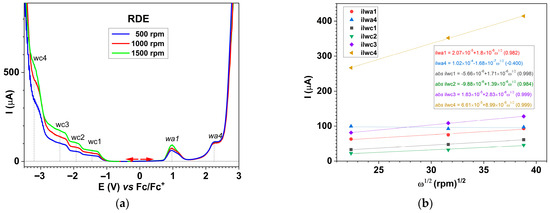 Oxidation and reduction curves were recorded using the RDE technique at different rotation rates (500–1500 rpm) for L in 0.1 M TBAP/ACN, starting from the stationary potential, as seen in Figure 10. The main oxidation and reduction (w1–w4) waves were identified corresponding to the peaks obtained in DPV and CV curves (see Figure S2). The currents of the anodic and cathodic waves increased with the electrode rotation rate in a different manner, as will be discussed further in the Section 3.