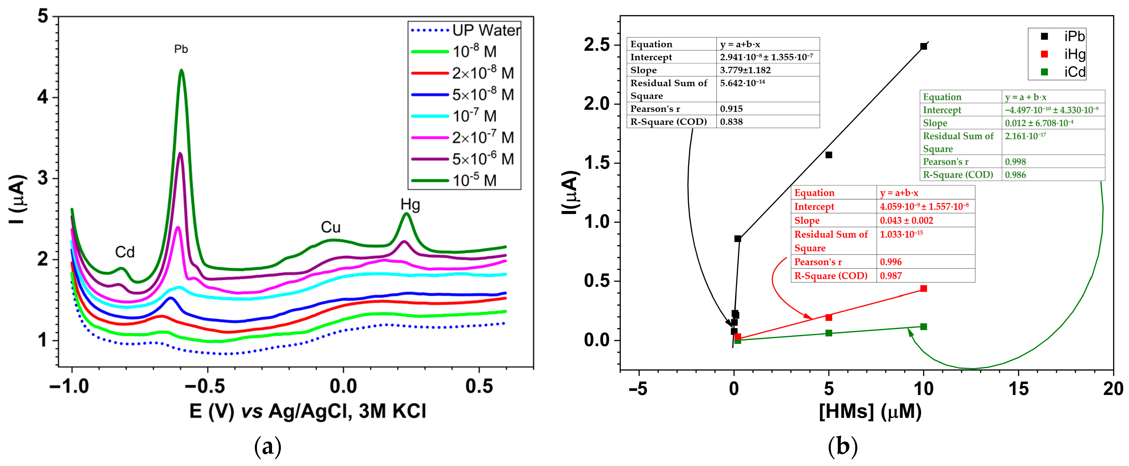 - Sulthana, S.F.; Iqbal, U.M.; Suseela, S.B.; Anbazhagan, R.; Chinthaginjala, R.; Chitathuru, D.; Ahmad, I.; Kim, T.H. Electrochemical Sensors for Heavy Metal Ion Detection in Aqueous Medium: A Systematic Review. ACS Omega 2024, 9, 25493–25512. [Google Scholar] [CrossRef] [PubMed]