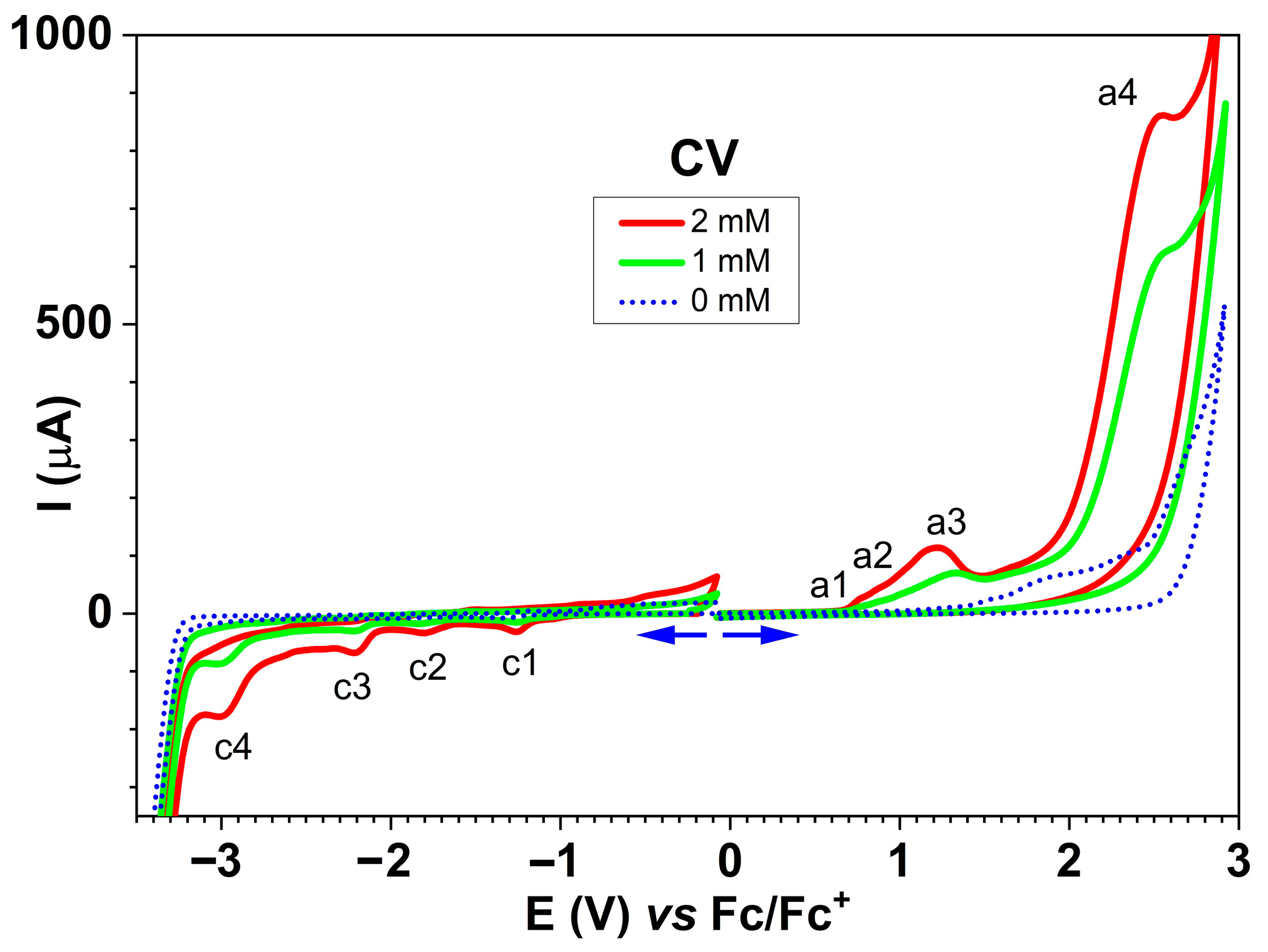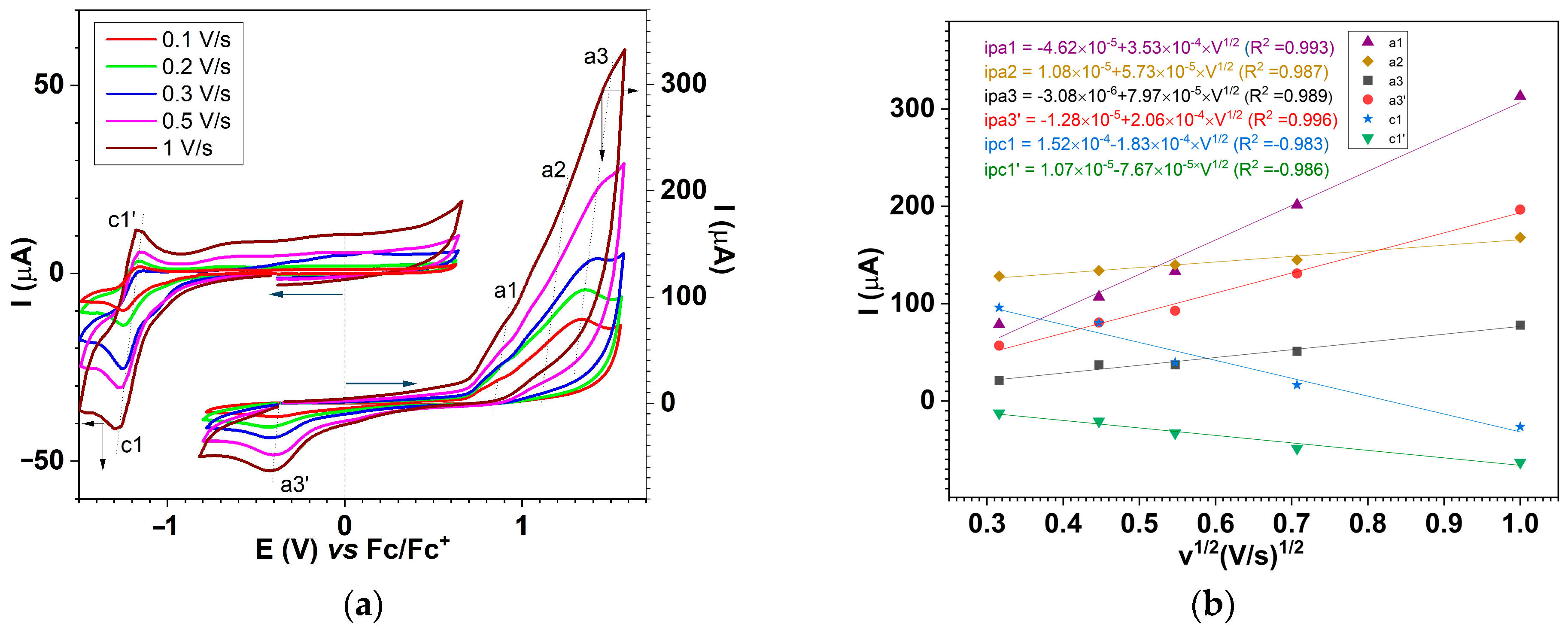2.6. Investigation of the Ligand’s Electrochemical Properties