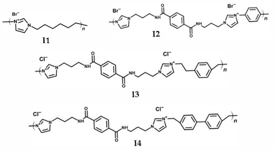 I2 was obtained by copolymerization between M2 and 1,6-dibromohexane following the synthesis protocol of Bara et al. [54]. Firstly, the M2 and 1,6-dibromohexane were added in an equimolar amount to a 50 mL round-bottom flask. A quantity of 10–15 mL of NMP was then added, and the flask was sealed with a rubber cap. Once M2 was completely dissolved, an injection needle was inserted through the rubber cap to equalize the pressure. When the reaction was completed, the heat was switched off and the mixture was cooled to room temperature for 1 h. The inner walls of the flask and the stir-bar were coated by the polymer, as it had precipitated from the solution during the proceeding polymerization. NMP was decanted, the polymer washed 2 times with 30–40 mL of MTBE and the solvent was removed via rotary evaporation. Finally, the polymer (Mw ~ 6000 g/mol) was dried in the vacuum oven between 100 and 155 °C. Yield: 0.734 g (93.5%). 1H-NMR (δ, 300 MHz, DMSO-d6): 8.59 (s), 7.47 (d), 7.24 (s), 7.11 (s), 4.02 (t), 3.14 (t), 1.93 (t), 1.46 (t), 0.96 (t) ppm.