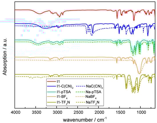Independent of the type of anions, absorption bands between 3200–2800 cm−1 were detected, which are related to stretching vibrations of N-H and C-H groups [56,57,58]. Additionally, the N-H stretching bands of the imidazole ring arose at 2940 cm−1 and 2861 cm−1. The successful anion exchange with C(CN)2− was evidenced by the appearance of new peaks at 2286 cm−1, 2227 cm−1, and 2149 cm−1 related to C≡N vibration bands [56,57]. For I1-pTSA, the characteristic p-toluene sulfonate peaks were detected at 1121 cm−1, 1011 cm−1, and 678 cm−1, while for I1-Tf2N, new peaks appeared at 1346 cm−1 and 1050 cm−1. With respect to I1-BF4, the change in the FTIR spectrum was less pronounced but an additional characteristic peak was observed at 1010 cm−1, which can be assigned to the stretching vibrations of -BF4 bonds (as also observed for the corresponding spectrum of NaBF4) [59].