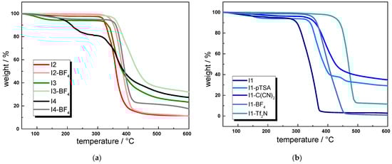 A shift towards higher thermal stability can be also observed in I2, I3, and I4 when exchanging the bromide or chloride anion with BF4−. The stabilizing effect is particularly pronounced for I4, for which Tonset increased from 185 to 342 °C. Here, the exchange of chloride with BF4− even changes the degradation mechanism from a two-stage to a one-step process.