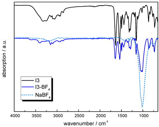 ATR-FTIR spectra of I3 prior to and after exchange with NaBF4 (solid lines) and spectrum of NaBF4 as reference (dotted lines).