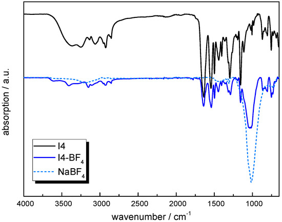 ATR-FTIR spectra of I4 prior to and after exchange with NaBF4 (solid lines) and spectrum of NaBF4 as reference (dotted lines).