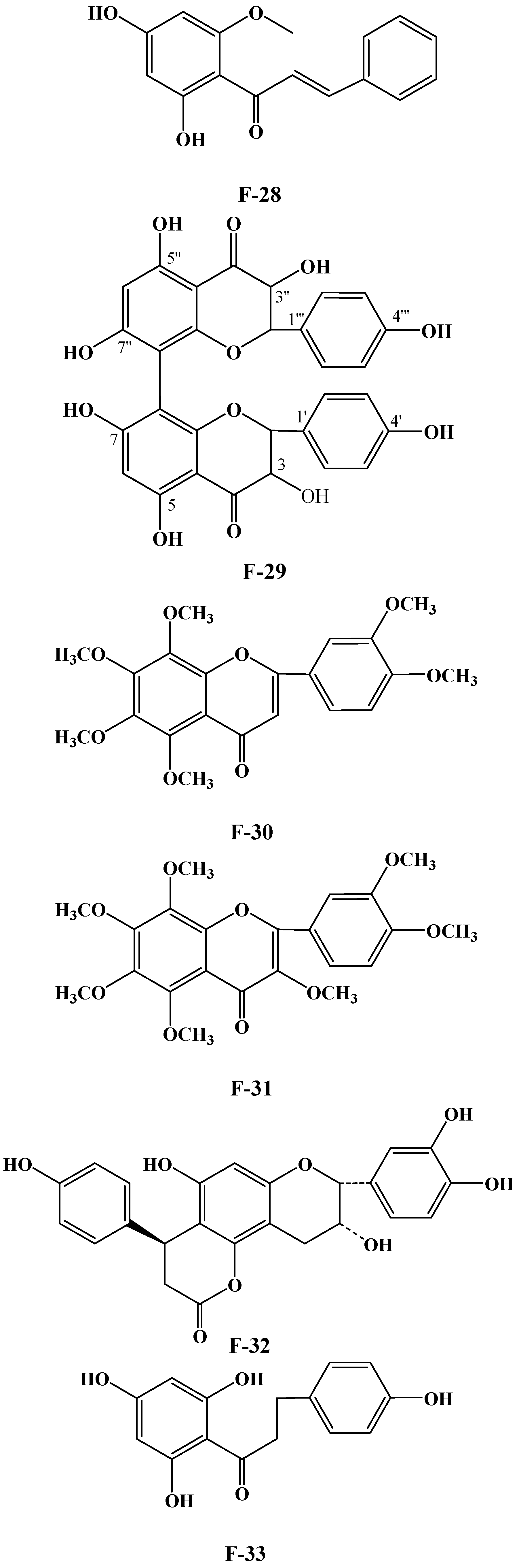 Numerous plants contain flavonoids, which are significant secondary metabolites. According to research, C. oleifera fruits have a comparatively large and diverse concentration of these components, primarily flavonols and their glycosides. Its structural mother nucleus is mainly composed of flavonols such as quercetin and kaunferol [36]. Arabinose (Ara), xylose (Xyl), glucose (Glc), rhamnose (Rha), and galactose (Gal) make up the majority of the sugar chain. The structural mother nucleus of the flavonoids found in C. oleifera fruit is displayed in Figure 4. The following are 19 of them listed in Table 2. The chemical structures of kaempferol-3-O-[6-trans-p-coumarol]-β-D-glucopyranosyl-(1 → 3)-α-L-rhamnopyranosyl-(1 → 6)-O-β-D-galactopyranoside (F-20) [37], naringenin-7-O-[β-D-xylopyranosyl-(1 → 6)][β-D-glucopyranosyl(1 → 3)-α-L-rhamnopyranosyl(1 → 2)-O-β-D-glucopyranoside (F-21), naringenin-7-O-[β-D-glucopyranosyl(1 → 3)-α-L-rhamnopyranosyl(1 → 2)-O-β-D-glucopyranoside (F-22), naringenin-7-O-β-D-xylopyranosyl-(1 → 6)-β-D-glucopyranoside (F-23) [20], naringoside (F-24) [33], naringenin (F-25) [5], (+)-4′-methylcatechin-7-O-β-D-glucopyranoside (F-26) [20], taxifolin (F-27) [38], cardamonin (F-28) [39], 4′,4′″,5,5″,7,7″-hexahydroxy-8,8″-biflavanonol (F-29) [39,40], 5,6,7,8,3′,4′-hexamethoxyflavone (F-30), 3,5,6,7,8,3′,4′-hexamethoxyflavone (F-31) [38], epicatechin-(5,6-bc)-4β-(p-hydroxyphenyl)-dihydro-2(3H)-pyranone (F-32), phloretin and (F-33) [41] are presented in Figure 5.