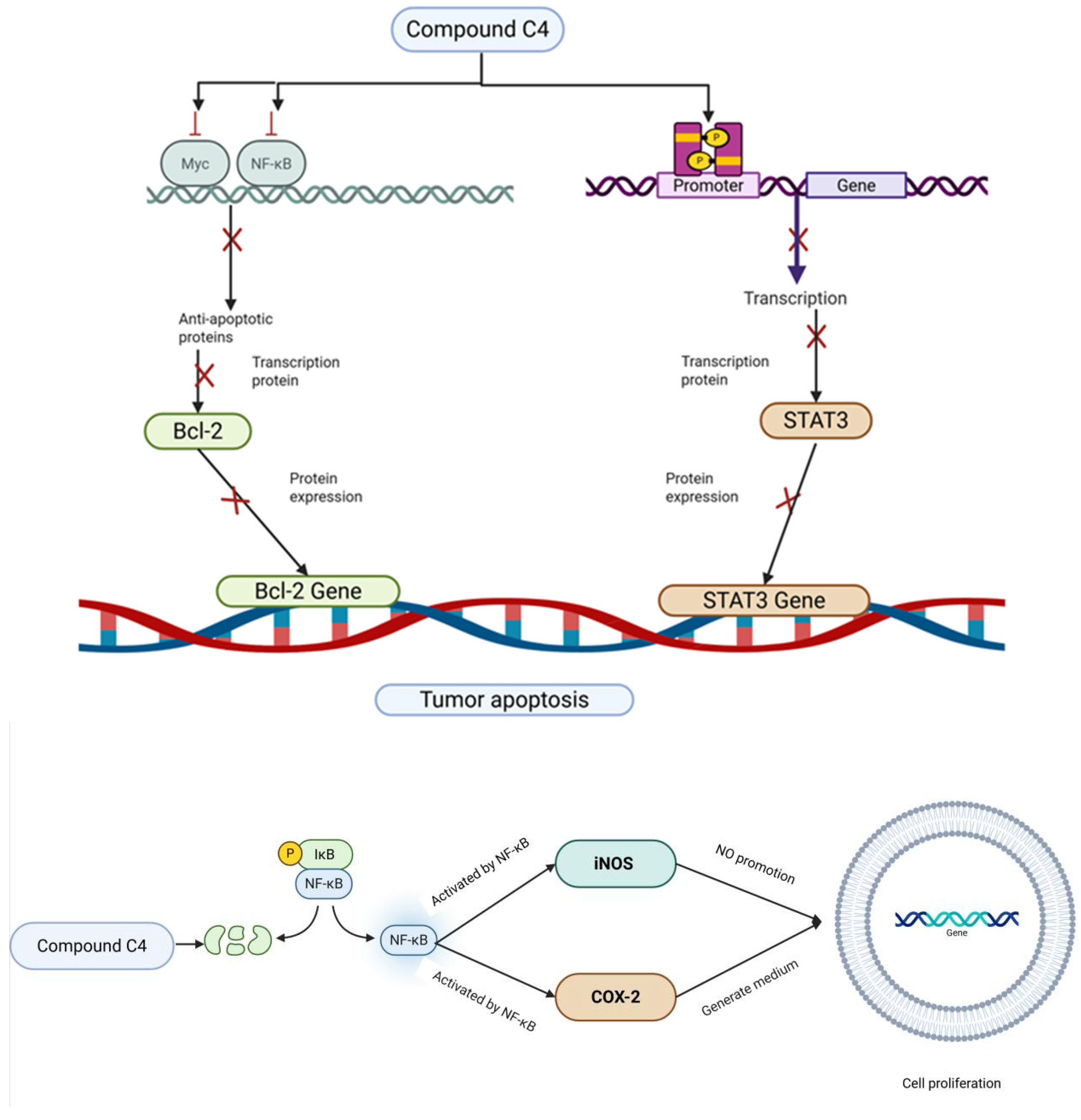 Previous studies have shown C. oleifera saponins exhibit significant anti-tumor effects both in vivo and in vitro, exerting direct cytotoxic actions and inhibiting the proliferation of tumor cells (Table 4). The cytotoxicity of oleiferasaponin B1 and B2 was evaluated in four human carcinoma cell lines: A549, SK-OV-3, SK-MEL-2, and HCT15. Both of them exhibited significant cytotoxic activity with IC50 values of 18.5 μM, 11.3 μM, 13.9 μM, and 1.6 μM; and IC50 values of 8.4 μM, 6.3 μM, 9.2 μM, and 0.8 μM [24]. Oleiferasaponin C1, C2, and camelliasaponin B1 showed significant cytotoxic activities against BEL-7402, BGC-823, MCF-7, HL-60, and KB, five human tumor cell lines [25]. Oleiferasaponin C4~C6 from the seeds of C. oleifera can inhibit proliferation through inducing cell-cycle arrest and apoptosis in human cancer cell lines (BEL-7402, BGC-823, MCF-7, HL-60, and KB) in vitro [26,27]. Oleiferasaponins D1 and D2 exhibited cytotoxic activity against five human cancer cell lines (HCT-116, HepG2, BGC-823, NCI-H1650, and A2780), with IC50 values ranging from 3.31 to 10.23 μM. Oleiferasaponins D3~D5 showed moderate cytotoxic activities toward the tested cell lines [28]. C4 exhibits the strongest anticancer activity among the five cell lines, as evidenced by its ED50 value, which varies from 1.5 to 11.3 μM against Huh-7, HepG2, HeLa, A549, and SGC7901. This value is comparable to that of cisplatinum (CDDP) in these cell lines. Compound C4 may increase cell proliferation via the NF-B/iNOS/COX-2 pathway and induce apoptosis via the Bcl-2/Caspase-3 and JAK2/STAT3 pathways [31] (Figure 6). Bioactivity evaluations demonstrated that oleiferasaponins G6~G9, as well as the total saponin, exhibited significant proliferative inhibitory activity against HCT-116, HL-60, and HepG2 cell lines [32].