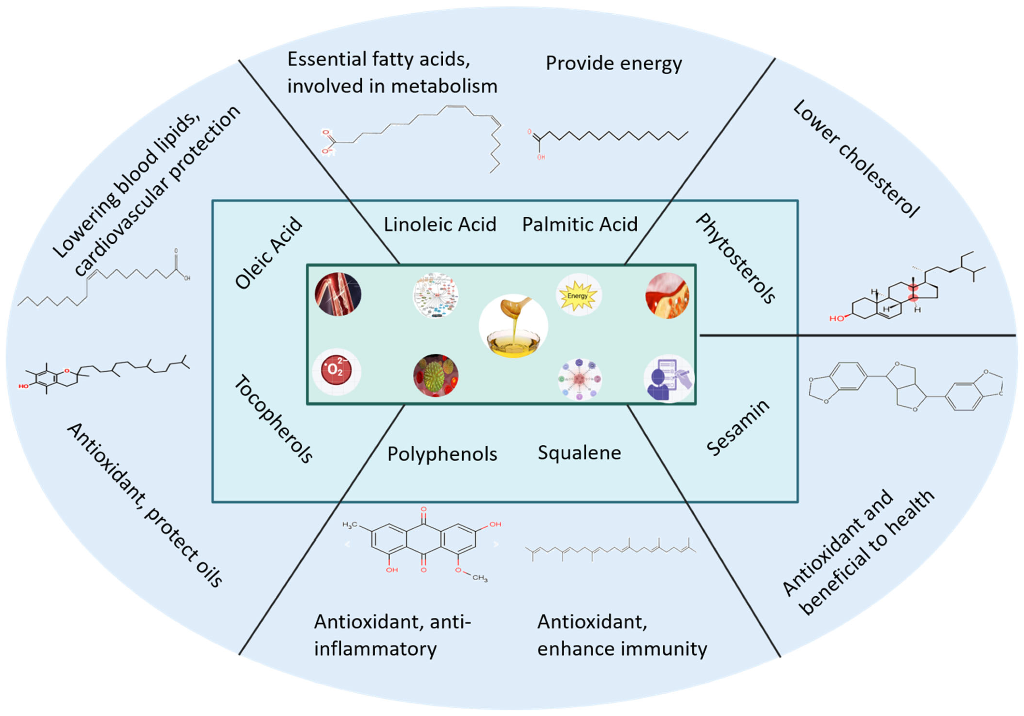 Camellia oil may elevate serum oleic acid levels and reduce body weight and BMI in individuals with hypertriglyceridemia who maintain stable dietary intake and physical activity [78]. Consuming camellia oil has been demonstrated to influence inflammatory indicators and oxidative stress in women with hypercholesterolemia. A diet high in tea oil has been shown to lower blood levels of malondialdehyde. Low-density lipoprotein cholesterol (LDL-C), malondialdehyde (MDA), and C-reactive protein (CRP) are examples of inflammatory indicators that can lower the risk of cardiovascular diseases [79].