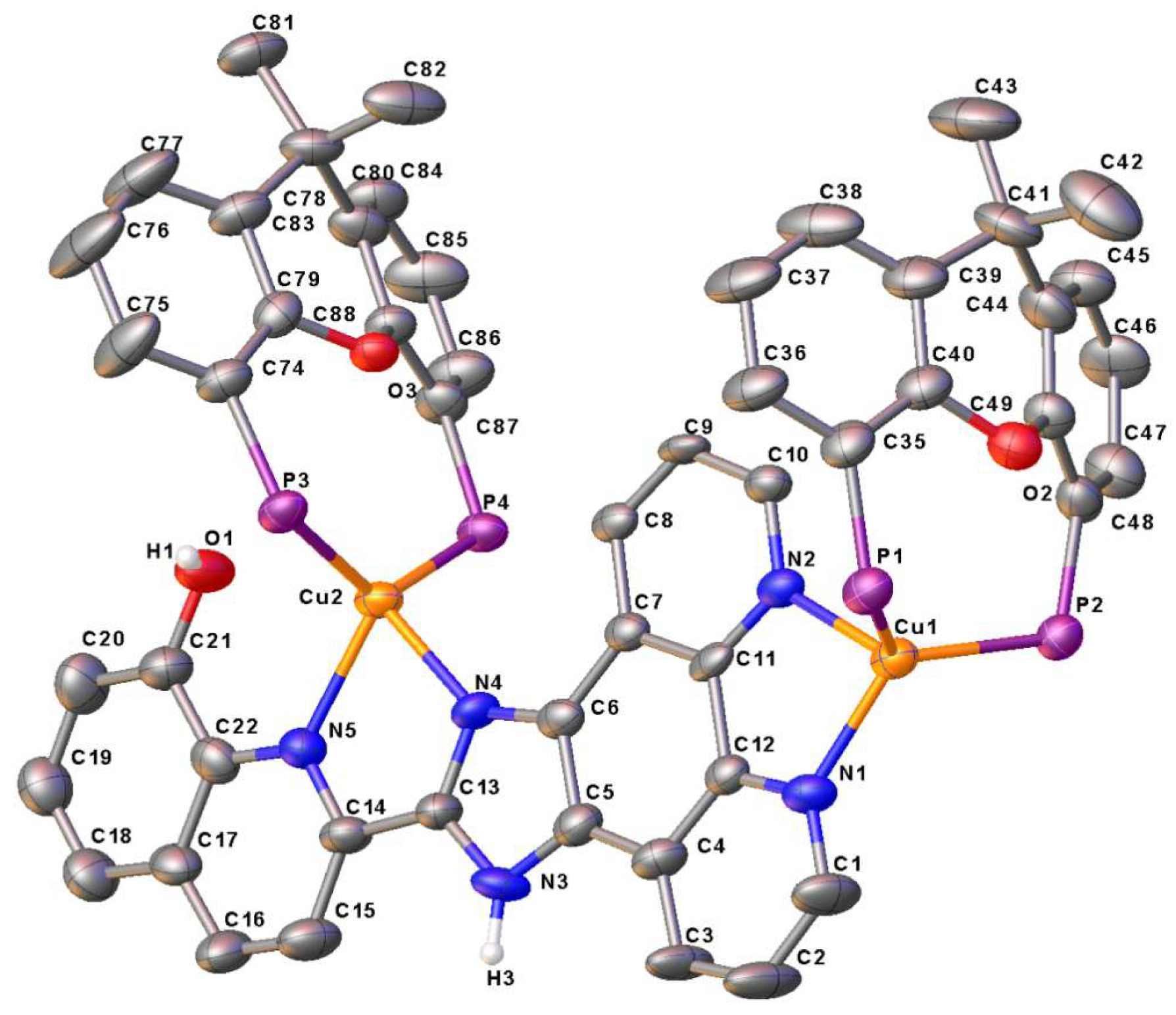 - Wu, Z.; Cui, S.; Zhao, Z.; He, B.; Li, X.L. Photophysical Properties of Homobimetallic Cu(I)–Cu(I) and Heterobimetallic Cu(I)–Ag(I) complexes of 2-(6-Bromo-2-pyridyl)-1H-imidazo[4,5-f][1,10]phenanthroline. New J. Chem. 2022, 46, 8881–8891. [Google Scholar] [CrossRef]
