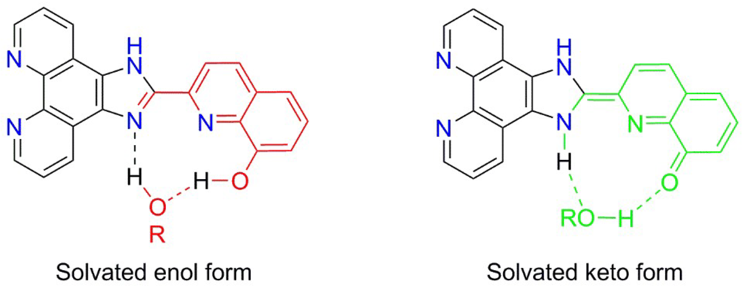 - Wang, Y.; Mu, H.; Sun, Y.; Gao, J.; Zhu, X.; Li, H. Modulating the ESIPT Mechanism and Luminescence Characteristics of Two Reversible Fluorescent Probes by Solvent Polarity: A Novel Perspective. Molecules 2024, 29, 1629. [Google Scholar] [CrossRef]