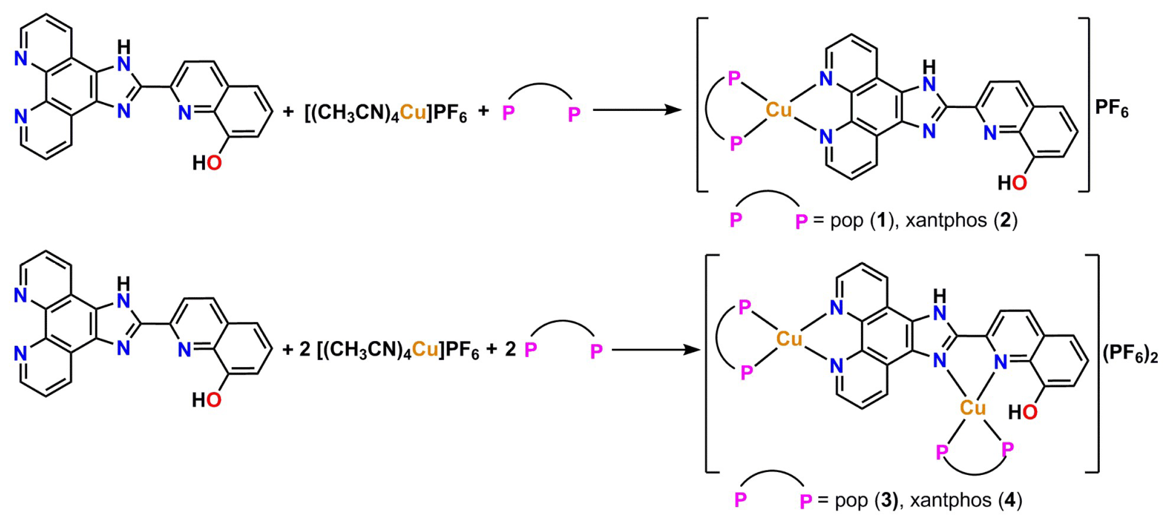- Xu, S.; Wang, J.; Zhao, F.; Xia, H.; Wang, Y. Copper(I) Complexes of Phenanthrolineimidazole Ligands: Structures, Photophysical Properties, and Quantum Chemical Studies. Transit. Met. Chem. 2015, 40, 723–732. [Google Scholar] [CrossRef]