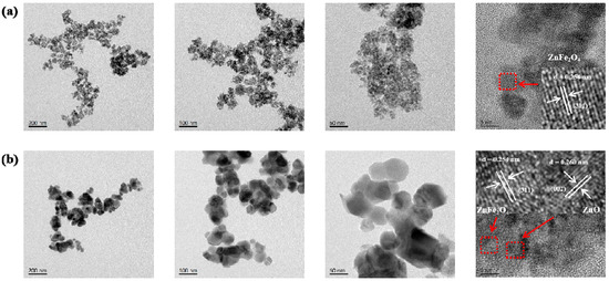 TEM and HRTEM images of (a) ZnFe2O4, (b) ZnO/ZnFe2O4.
