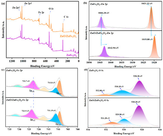 XPS of (a) survey spectra, (b) Fe 2p, (c) Zn 2p, and (d) O 1s of ZnFe2O4 and ZnO/ZnFe2O4.