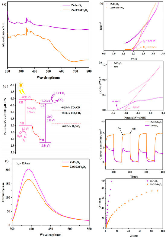 (a–c) UV-vis DRS, (d) proposed photocatalytic mechanism, (e) transient photocurrent response plots, (f) PL, and (g) EIS of ZnO and ZnO/ZnFe2O4.