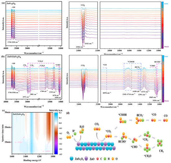 (a–c) In situ FTIR and (d) the possible processes for CO2 reduction of ZnO/ZnFe2O4.