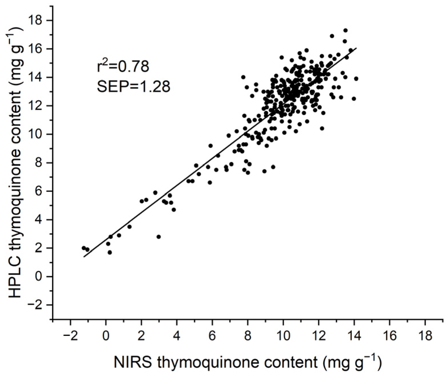 2.3. Predictability of NIRS for Selection of High Thymoquinone Content