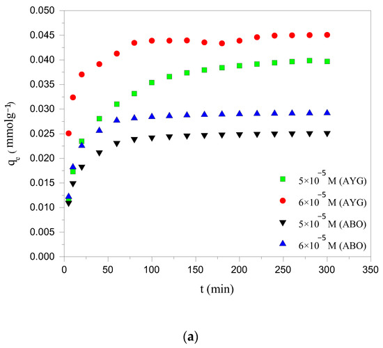 The AC-850-5 surface becomes negatively charged at pH values above pH 6.2 and this shift in surface charge leads to dominant electrostatic interactions with the positively charged dyes [13]. Above pH 6.2, these attractive interactions become the primary driving force for adsorption, leading to an enhanced dye uptake. However, the maximum adsorption capacity for both adsorbents did not show significant variations in terms of the solutions’ pH. Hence, the subsequent adsorption studies were performed at an original pH of both dye solutions (pH = 8.3 for AYG and pH = 6.4 for ABO).