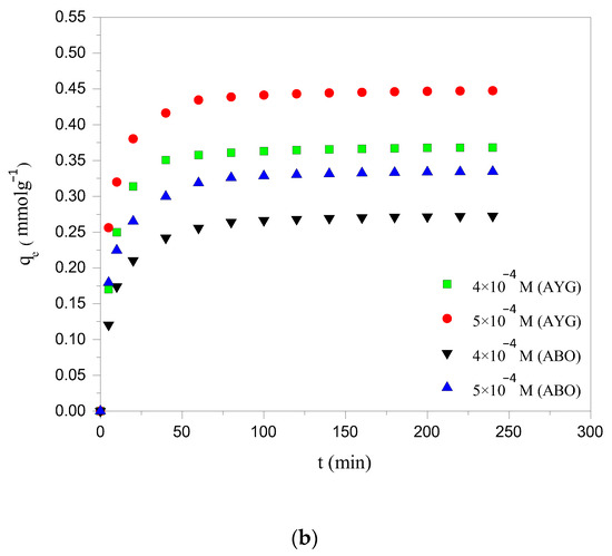 Effect of contact time and initial concentration on the adsorption of AYG and ABO onto (a) HC-230-4 (Ci: 5 × 10−5; 6 × 10−5 mol dm−3; T: 25 °C) and (b) AC-850-5 (Ci: 4 × 10−4; 5 × 10−4 mol dm−3; T: 25 °C).