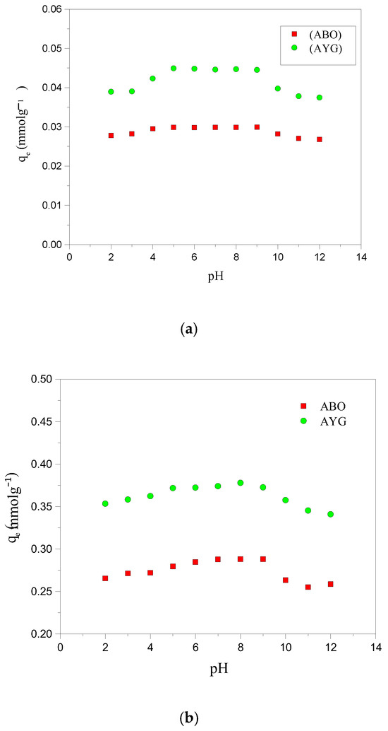Effect of pH on the adsorption of AYG and ABO onto (a) HC-230-4 (Ci: 6 × 10−5 mol dm−3; T: 25 °C) and (b) AC-850-5 (Ci: 4 × 10−4 mol dm−3, at 25 °C).