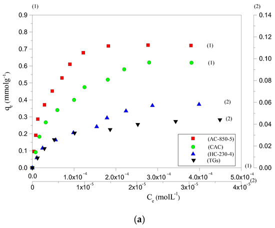 The removal efficiency of HC-230-4 and AC-850-5, at 25 °C, for the modeled dyes was also compared with the performance of TGs and with a commercial activated carbon (CAC surface area = 830 m2g−1, total pore volume = 0.48 cm3g−1, and average pore size = 2.31 nm). The N2 adsorption–desorption isotherm for the CAC was provided in Figure S1. The obtained isotherms are included in Figure 3a,b. It was found that the amount of AYG adsorbed was 0.048, 0.058, 0.637, and 0.723 mmolg−1 for TGs, HC-230-4, CAC, and AC-850-5, and the order for the ABO was 0.023, 0.030, 0.346, and 0.390 mmolg−1 for TGs, HC-230-4, CAC, and AC-850-5, respectively.