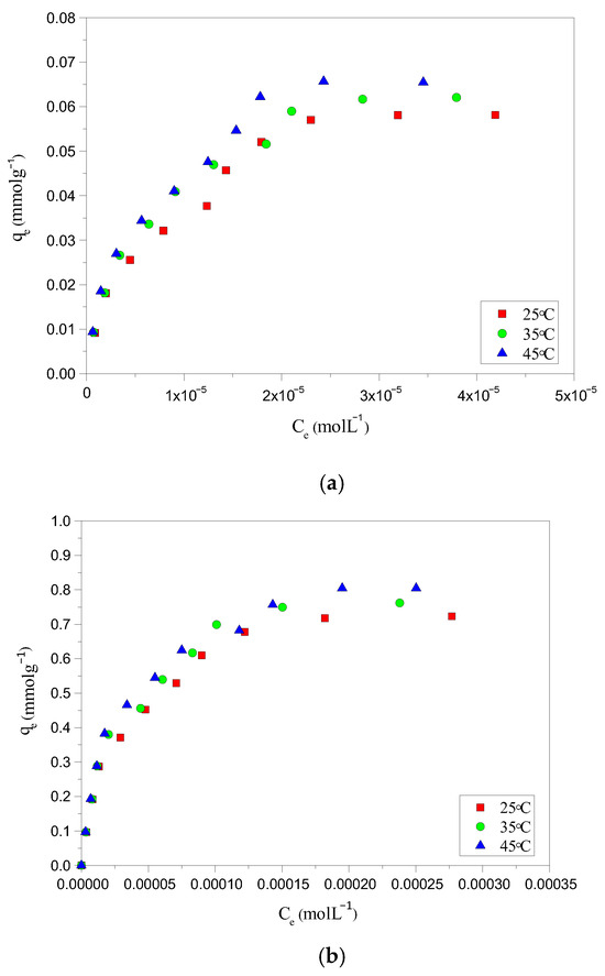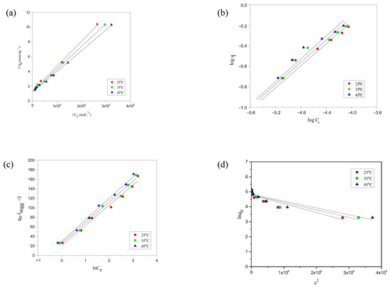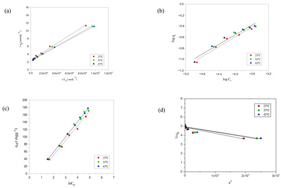 The Temkin isotherm model [43] is often used to account for indirect interactions between adsorbent and adsorbate molecules. It assumes that the adsorption heat decreases linearly with the surface coverage, which is typically valid for the intermediate concentration range. In this study, the Temkin isotherm was applied in its empirical linearized form (Table 2). Although BT is sometimes expressed thermodynamically as BT = RT/bT, this formulation can lead to dimensional inconsistencies when qe is reported in mass-based units. Therefore, following Chu [44], in this work, the Temkin model is treated purely as an empirical fit, and only the Temkin binding constant (KT) and coefficient of determination R2 are reported to represent adsorption affinity and model fitting accuracy.