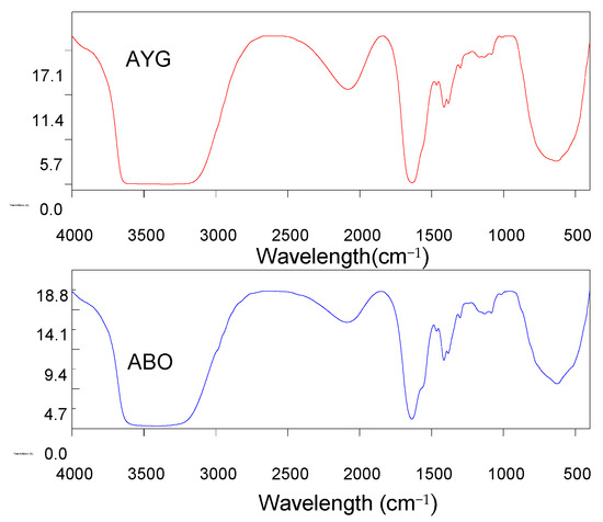 FTIR spectra after the adsorption of AYG and ABO onto AC-850-5.