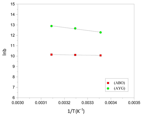To investigate the feasibility and nature of the adsorption of AYG and ABO onto HC-230-4 and AC-850-5, experiments were conducted at three distinct temperatures, 25, 35 and 45 °C. Subsequently, the ΔS° and ΔH° of the adsorption process were determined by analyzing the linear relationship between the logarithm of the adsorption capacity (lnb) and reciprocal temperature (1/T). Van’t Hoff plots for the AYG and ABO are shown in Figure 8, for AC-850-5, and the corresponding parameters obtained were reported in Table 5. Similar graphs were obtained for the adsorption of both dyes onto HC-230-4, and are provided in the Supplementary Materials (Figure S5).