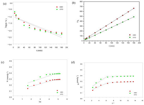 (a) PFO; (b) PSO; (c) Elovich; and (d) intraparticle kinetic plots for the adsorption of AYG and ABO onto AC-850-5 (Ci: 4 × 10−4 moldm−3; T: 25 °C).