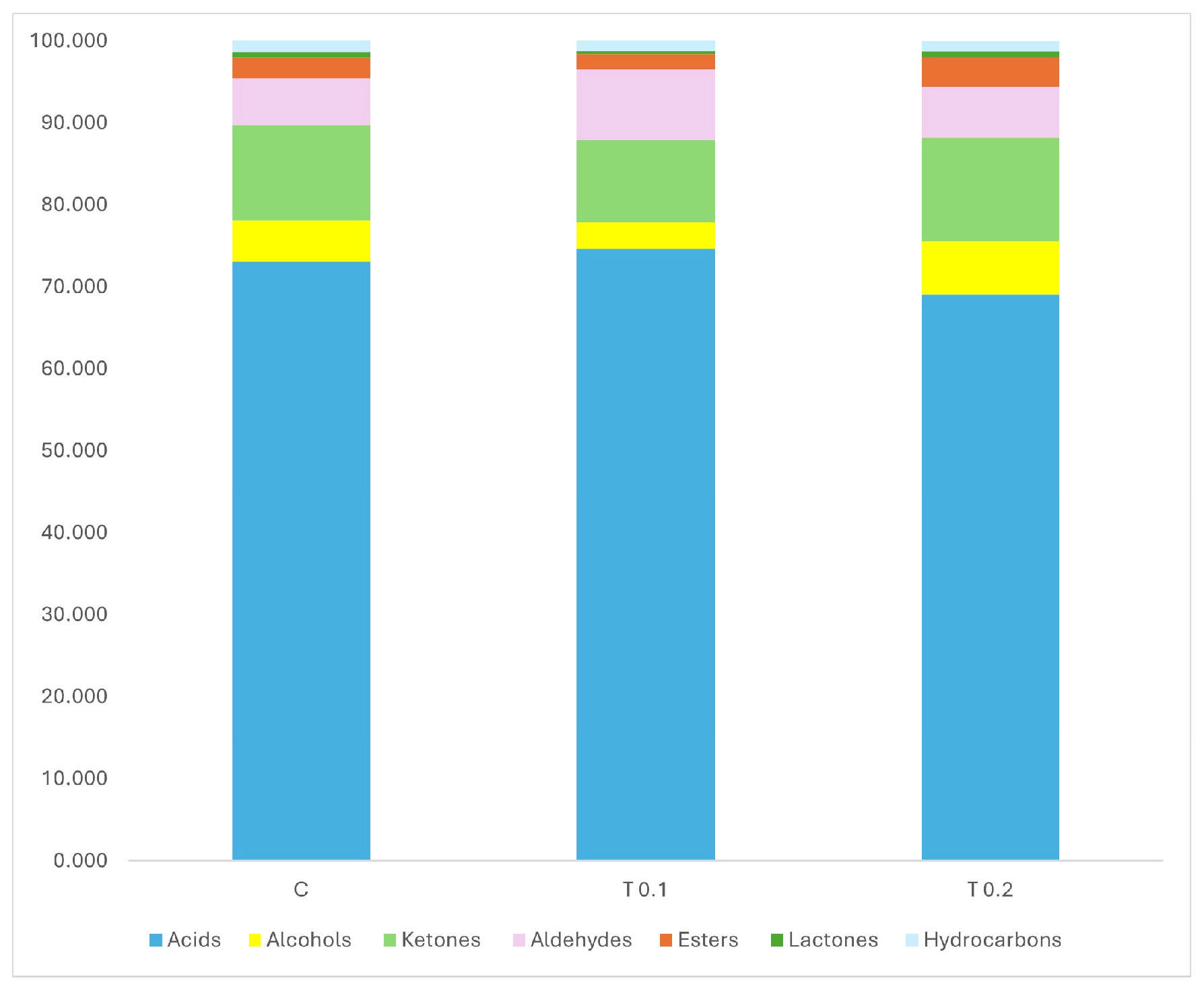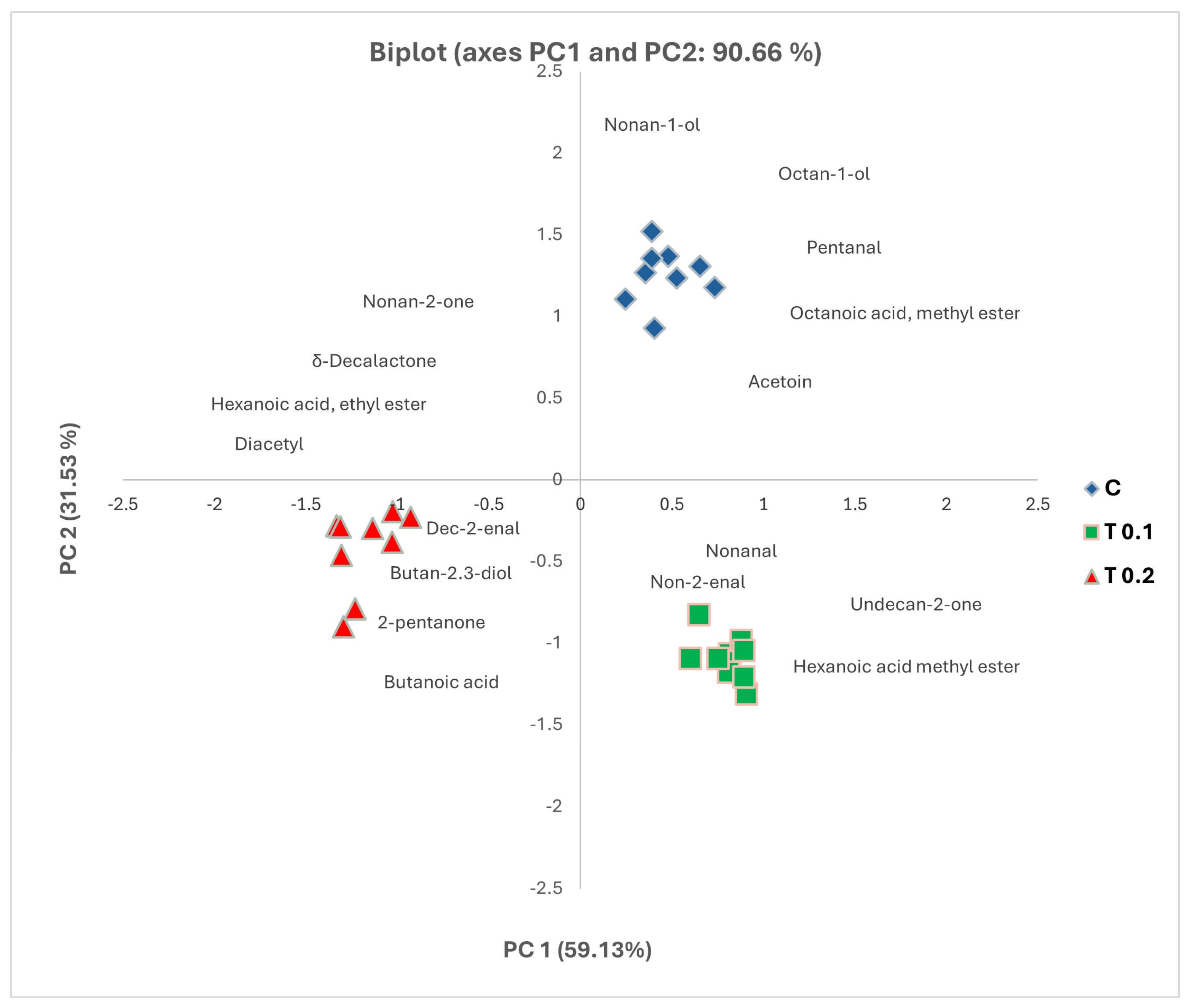2.4. Influence of Dietary Polyphenols on Odour Impact Ratio Values (OIRs) and Identification of Key Volatile Compounds in Caciotta Cheese