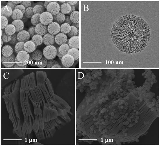 MHCs were synthesized via a one-pot process as previously reported in the literature [25]. Briefly, Tetrapropoxysilane (TPOS) (3.46 mL, 12 mmol) was added to the solution containing ethanol (70 mL), H2O (10 mL), and NH3·H2O (3 mL, 25 wt %) under stirring at room temperature. After 15 min, resorcinol (0.4 g) and formaldehyde (0.56 mL, 37 wt %) were added to the solution and the system was continuously stirred for 24 h. The precipitates were separated by centrifugation (8000 rpm for 10 min), washed with water and ethanol three times, and dried at 50 °C overnight. After that, MHCs were obtained after carbonization at 700 °C under N2 for 5 h and silica was removed by NaOH (4 mol/L) for two days.