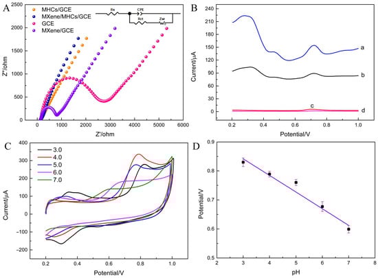 (A) The Nyquist plots of modified electrodes; supporting electrolyte: 0.1 M KCl containing 5 mM Fe(CN)63−/4−; frequency range: 0.01 Hz to 100 KHz. (B) DPVs of 100 μM BPA on bare GCE (d), MXene/GCE(c), MHCs/GCE (b) and MXene/MHCs/GCE (a) in 0.1 M PBS (pH = 4.0). (C) CV curves of MXene/MHCs/GCE at different pH values (3.0, 4.0, 5.0, 6.0, 7.0) in 0.1 M PBS containing 500 μM BPA. (D) Plots of Epa versus pH value for BPA.