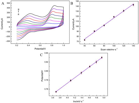 Electrochemical tests were performed using a CHI 650E electrochemical workstation (Shanghai Chenhua, Shanghai China). The reference electrode was Ag/AgCl, and the counter electrode was a platinum wire electrode. In total, 0.1 M phosphate buffer solution (PBS) was used as the supporting electrolyte. In cyclic voltammetry (CV), the scan rate was 100 mV·s−1, and the working window voltage was 0.2 V–1.0 V. In differential pulse voltammetry (DPV), the pulse amplitude was 0.05 V, the pulse period was 0.2 s, the enrichment time was 60 s, and the enrichment potential was 0 V. Electrochemical impedance tests were performed in a 0.1 M KCl solution containing 5.0 mM [Fe(CN)6]3−/4− in the frequency range from 0.01 to 105 Hz with an amplitude of 5 mV.