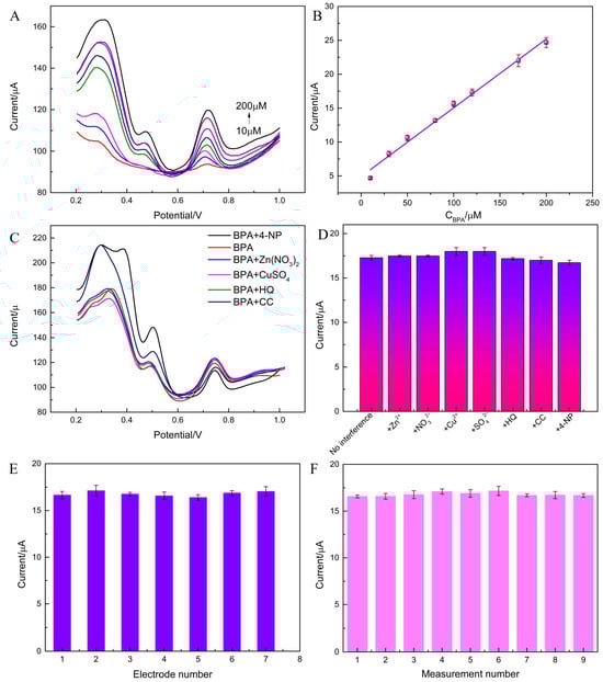 Optimal concentrations and peak currents were obtained. Within some concentration (BPA: 10–200 μM), the corresponding ipas increase with increasing concentration and show a certain linear relationship (Figure 4A,B).