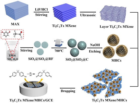 In this work, a high-performance electrochemical sensor for bisphenol A (BPA) was successfully constructed based on a Ti3C2Tx MXene/MHCs composite prepared via a simple ultrasonic method. The introduction of MHCs played a critical role in enhancing the sensor’s performance by effectively preventing the restacking of MXene sheets, thereby maximizing the accessible specific surface area. This synergistic combination created a material with rich surface porosity, excellent conductivity, and shortened ion transport pathways, collectively leading to accelerated electron transfer and electrochemical sensing capabilities.
