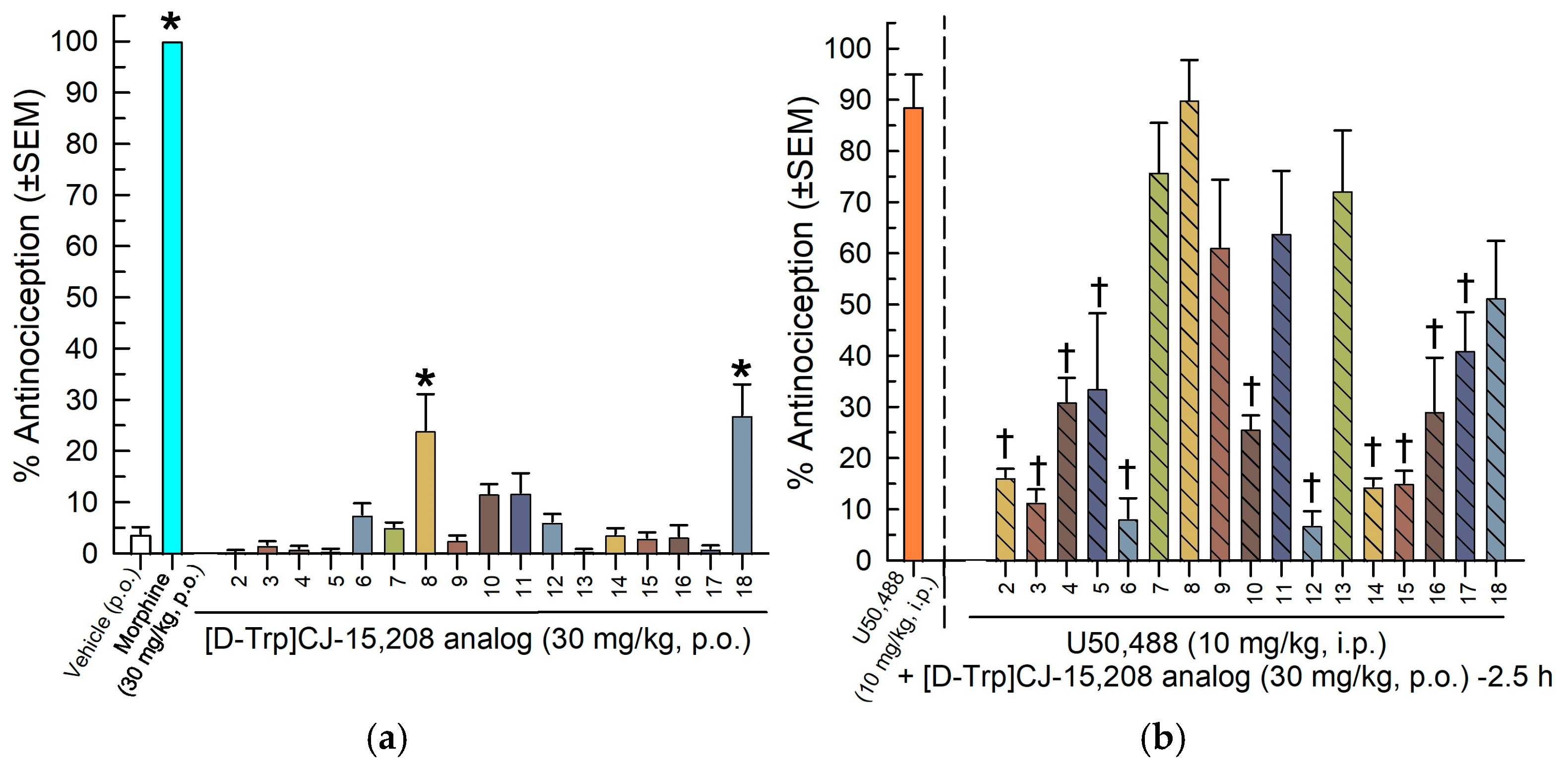 - Brice-Tutt, A.C.; Eans, S.O.; Yakovlev, D.; Aldrich, J.V.; McLaughlin, J.P. An analog of [D-Trp]CJ-15,208 exhibits kappa opioid receptor antagonism following oral administration and prevents stress-induced reinstatement of extinguished morphine conditioned place preference. Pharmacol. Biochem. Behav. 2022, 217, 173405. [Google Scholar] [CrossRef]