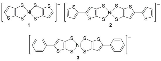 - Amb, C.M.; Rasmussen, S.C. Synthesis and Characterization of a New π-Extended Nickel Dithiolene Complex for Molecular Materials. Synth. Met. 2009, 159, 2390–2393. [Google Scholar] [CrossRef]