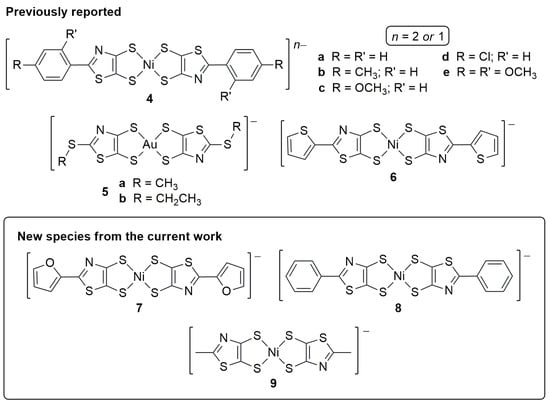 - Filatre-Furcate, A.; Auban-Senzier, P.; Fourmigué, M.; Roisnel, T.; Dorceta, V.; Lorcy, D. Gold dithiolene complexes: Easy access to 2-alkylthio-thiazoledithiolate complexes. Dalton Trans. 2015, 44, 15683–15689. [Google Scholar] [CrossRef]