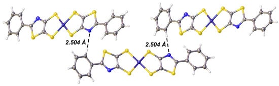 - Castillo, O.; Delgado, E.; Hernández, E.; Pérez, M.; Zamora, F. Structural Factors Governing the Formation of Extended Structures in Group 10 and 12 Metal-Dithiolenes. Cryst. Growth Des. 2020, 20, 4573–4584. [Google Scholar] [CrossRef]