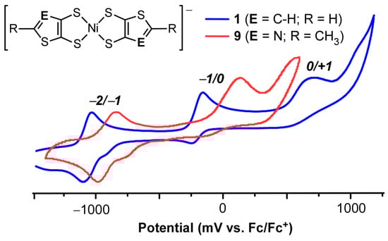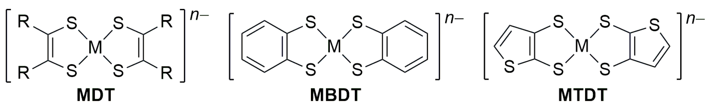 - Robertson, N.; Cronin, L. Metal bis-1,2-dithiolene complexes in conducting or magnetic crystalline assemblies. Coord. Chem. Rev. 2002, 227, 93–127. [Google Scholar] [CrossRef]