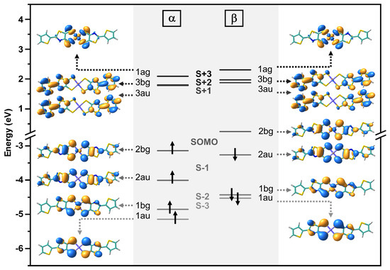 | SOMO-3α → SOMO+2α (22%) | π → π* | |||
