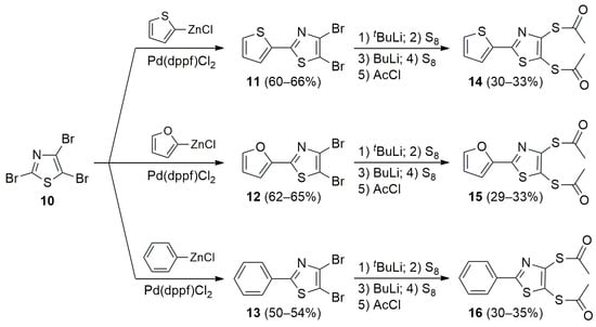 3.3.1. 4,5-Bis(thioacetate)-2-(2-thienyl)thiazole (14)