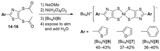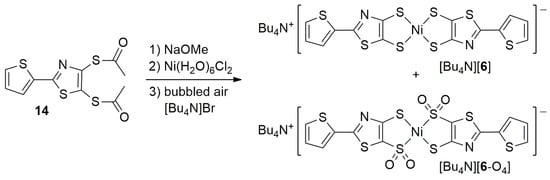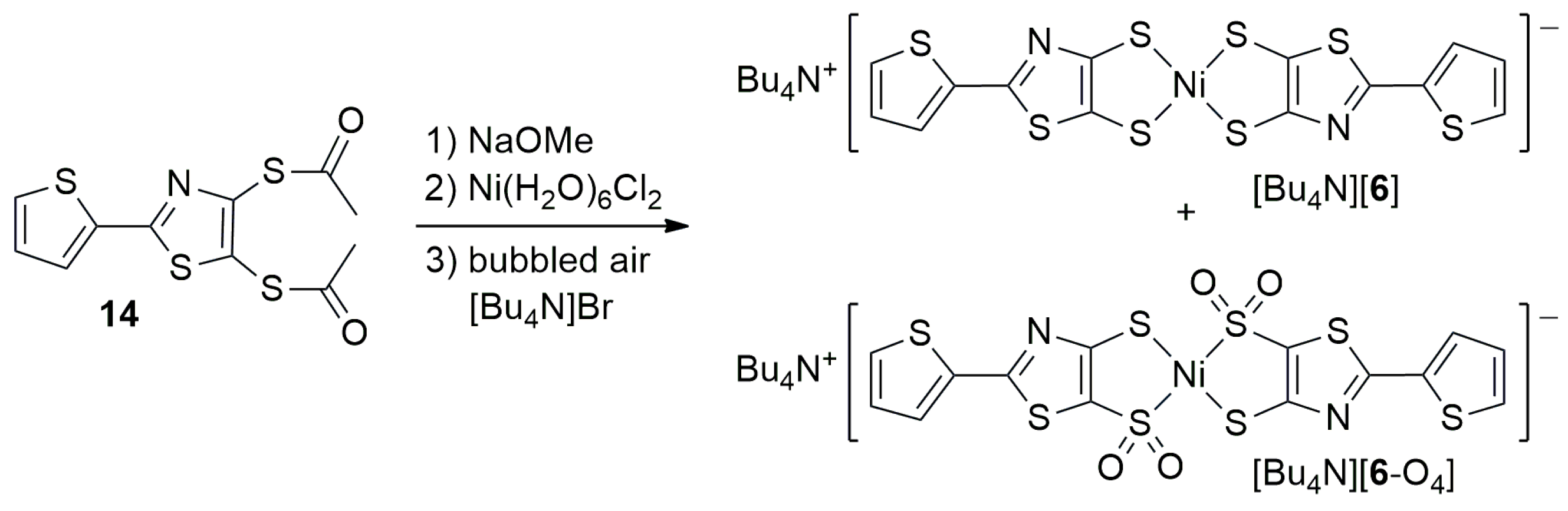 3.4.1. Tetrabutylammonium Bis[2-(2-thienyl)-4,5-thiazoledithiolato]nickelate(1−) ([Bu4N][6])