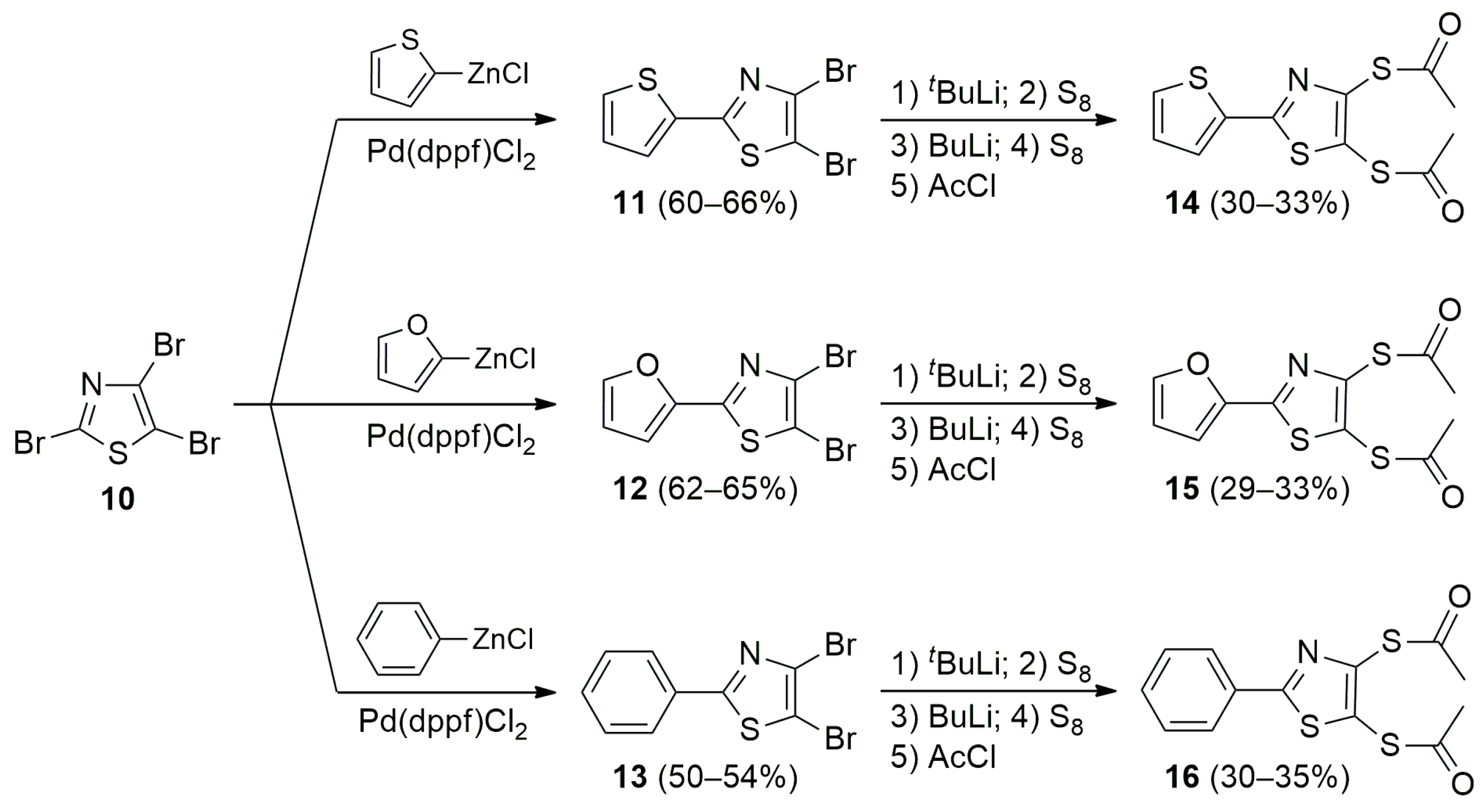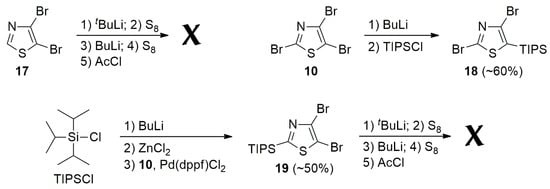 - Uzelac, E.J.; Rasmussen, S.C. Synthesis of Brominated Thiazoles via Sequential Bromination-Debromination Methods. J. Org. Chem. 2017, 82, 5947–5951. [Google Scholar] [CrossRef]